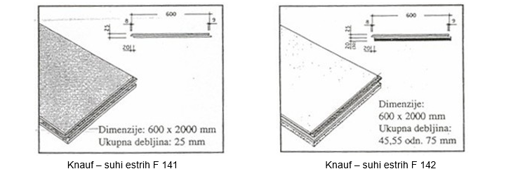 Suhi estrih služi kao lagana montažna podloga dobre zvučne i toplinske izolacije u obliku gipskartonskih ploča. Upotrebljavamo ga kod adaptacija zgrada kao konstrukciju plivajućeg poda jer je vrlo lagan, brzo se postavlja te pruža dobru zaštitu od požara.Sastoji se iz tri međusobno slijepljene gipsane ploče debljine 2,5 cm ili sa dodatnim slojem stiropora debljine 4,5 – 7,5 cm postavljene na ravnu podlogu.