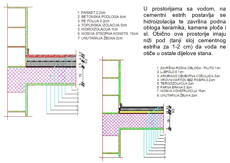 U ostalim suhim prostorijama postavlja se završna podna obloga. Ako zgrada ima podno grijanje cijevi se polažu u cementni estrih, a preko njih kamene ili keramičke pločice kako bi čim bolje isijavale toplinu